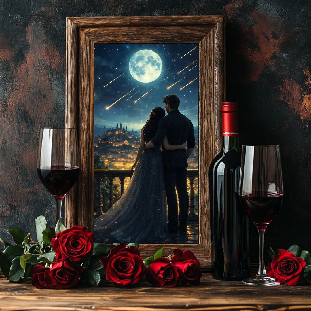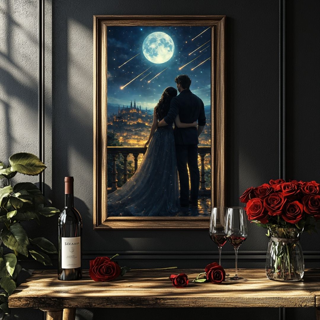 Set beneath a luminous moon and a sky alive with falling stars, this piece evokes the turning point of an epic romance - the calm before destiny unfolds. It’s a visual love letter to fantasy worlds, sweeping romances, and the quiet certainty of choosing each other against a backdrop of magic.